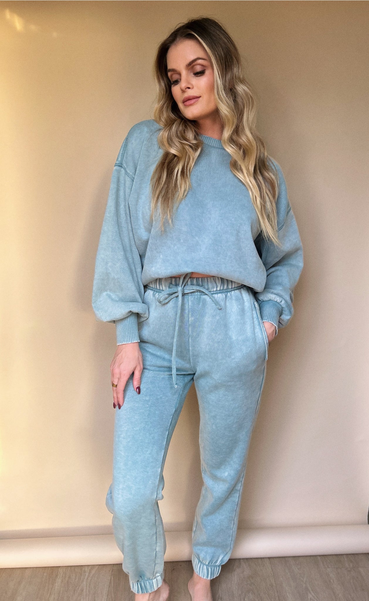 Effortless comfort meets elevated style in this ultra-soft blue washed lounge set. Designed with a relaxed silhouette, the set features a cozy long-sleeve pullover and matching high-waisted joggers. The joggers include an adjustable drawstring waistband, side pockets, and elastic cuffs for an easy, flattering fit.